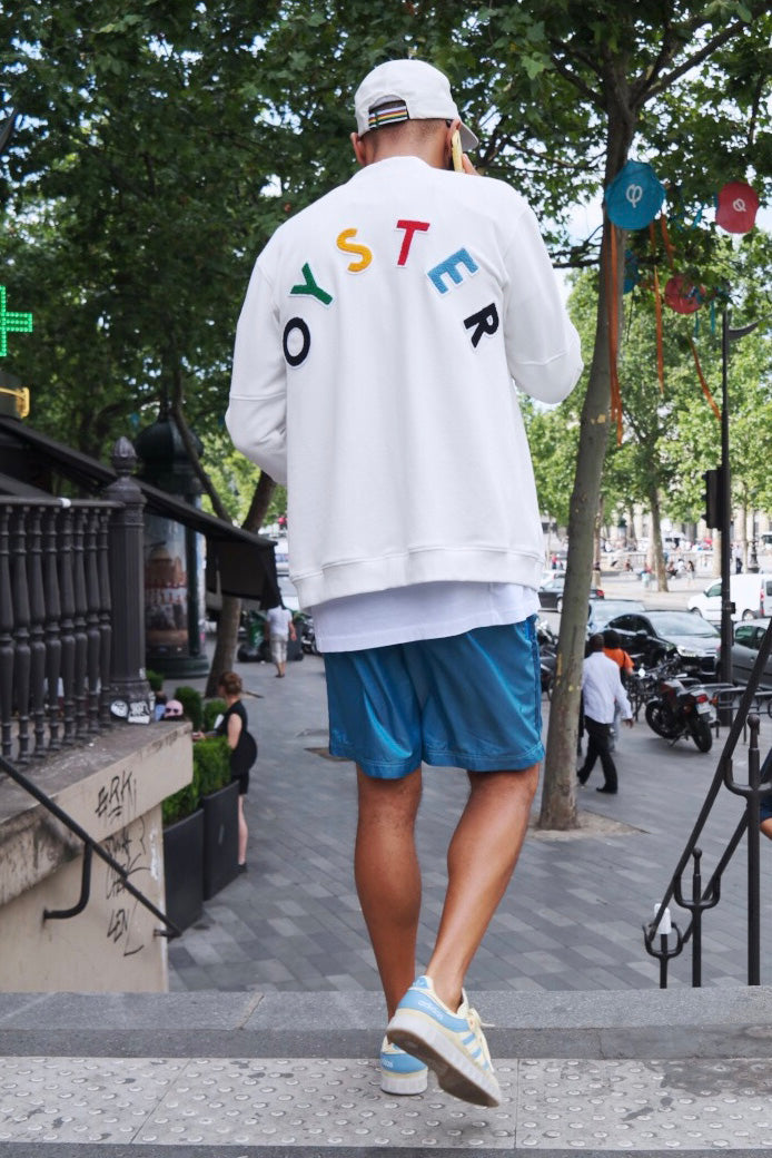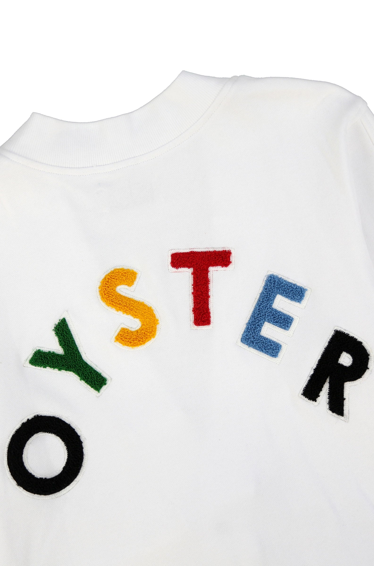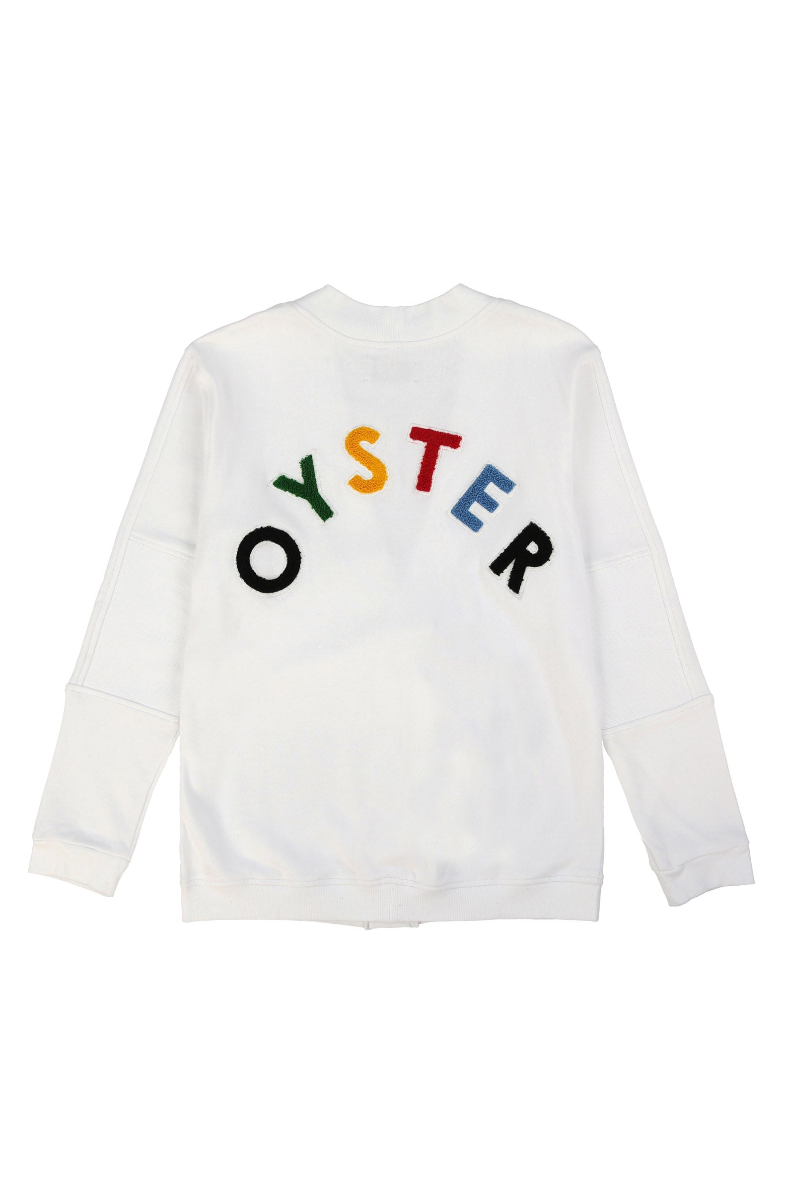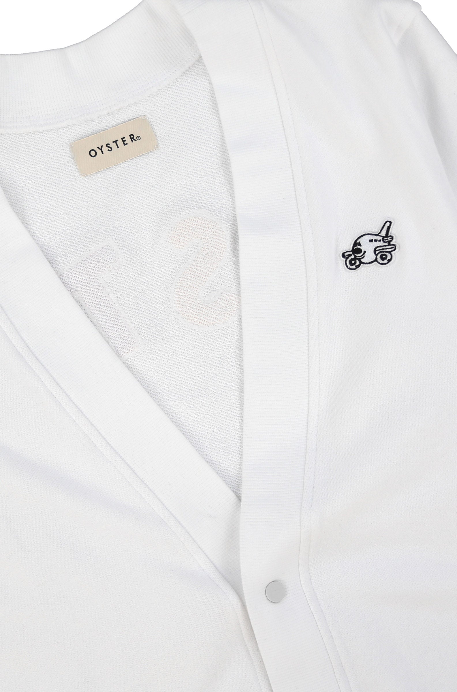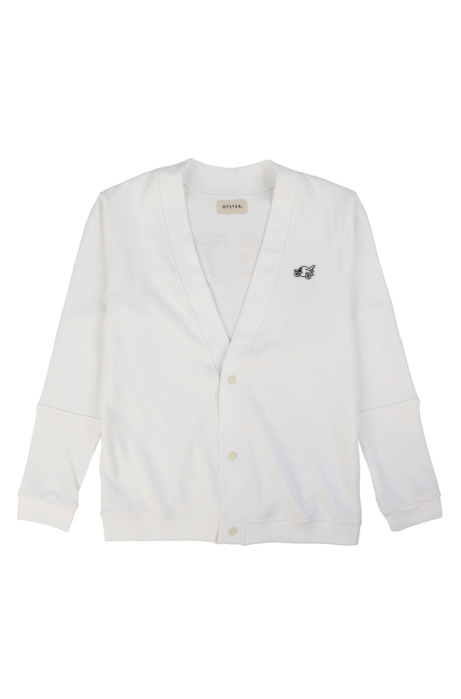 Cardigan in Japanese French Terry. Tonal rib at cuffs, hem, placket, and elbows. Oyster Airplane felt patch at left chest. Chenille oyster applique at the back.