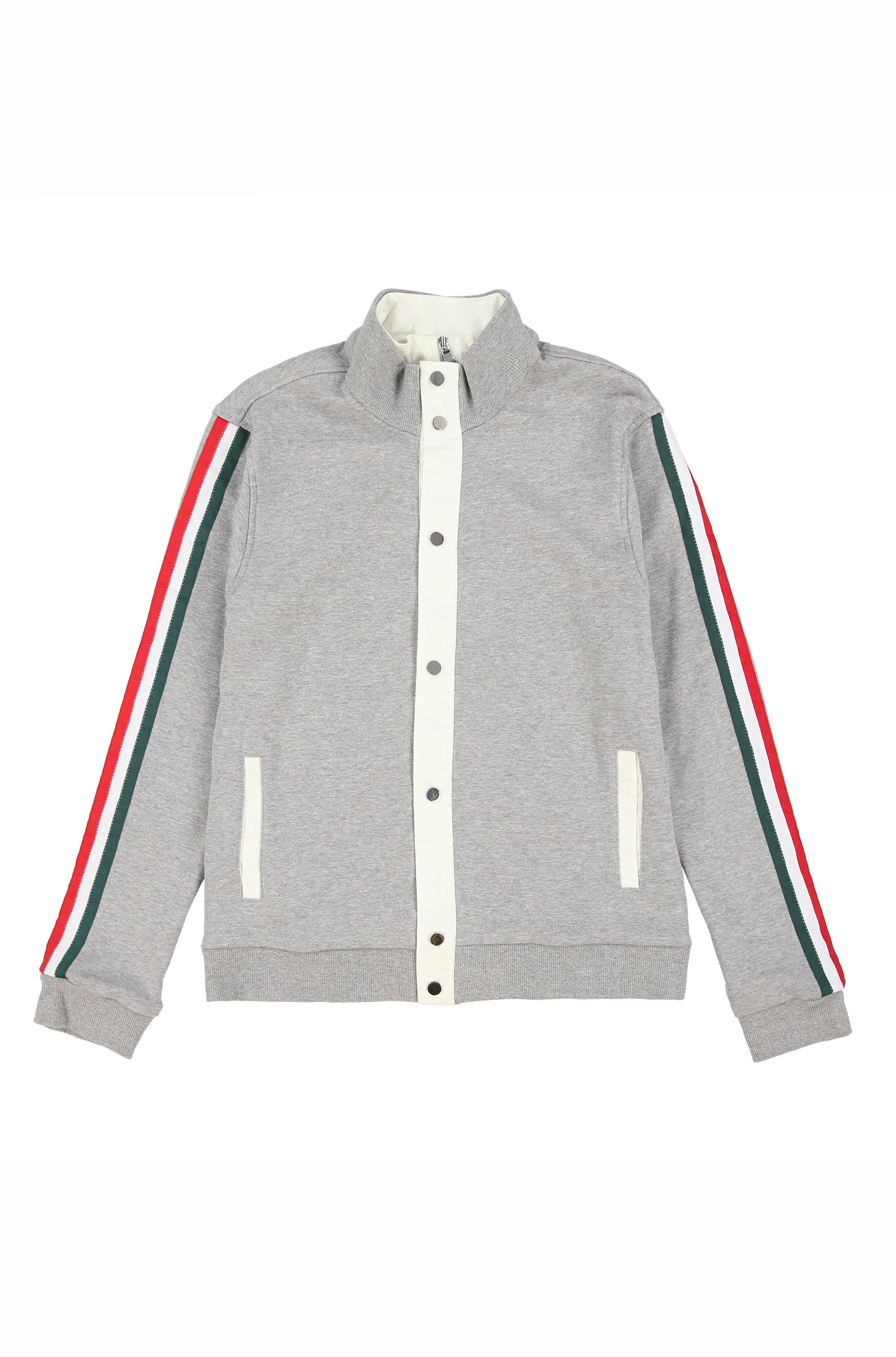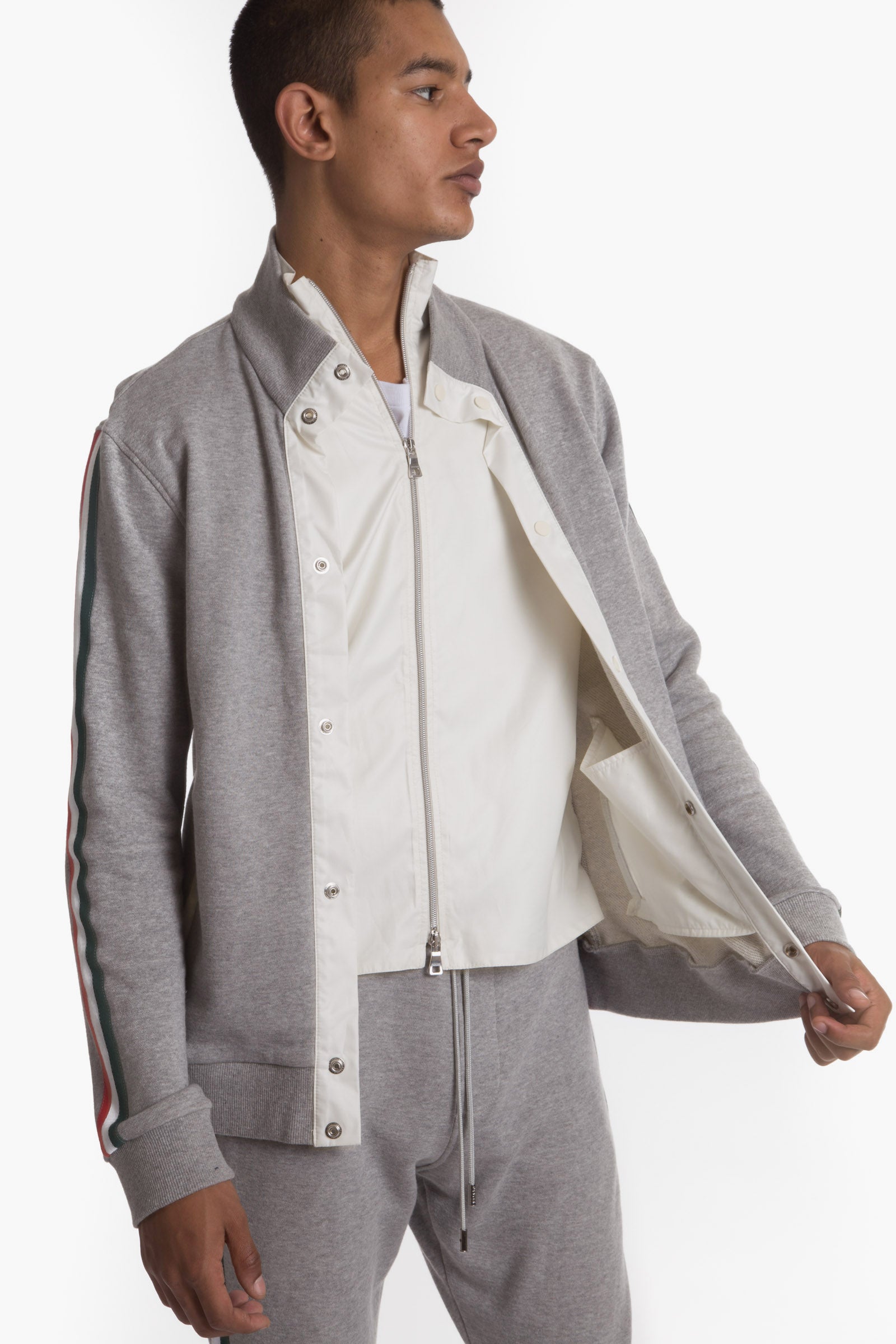 Mock Collar Track Jacket in Japanese French Terry with polyester ripstop inset double closure. Snap front outer closure and Lampo zip inner closure. Tonal rib at hem and cuffs. Custom tape on sleeves
