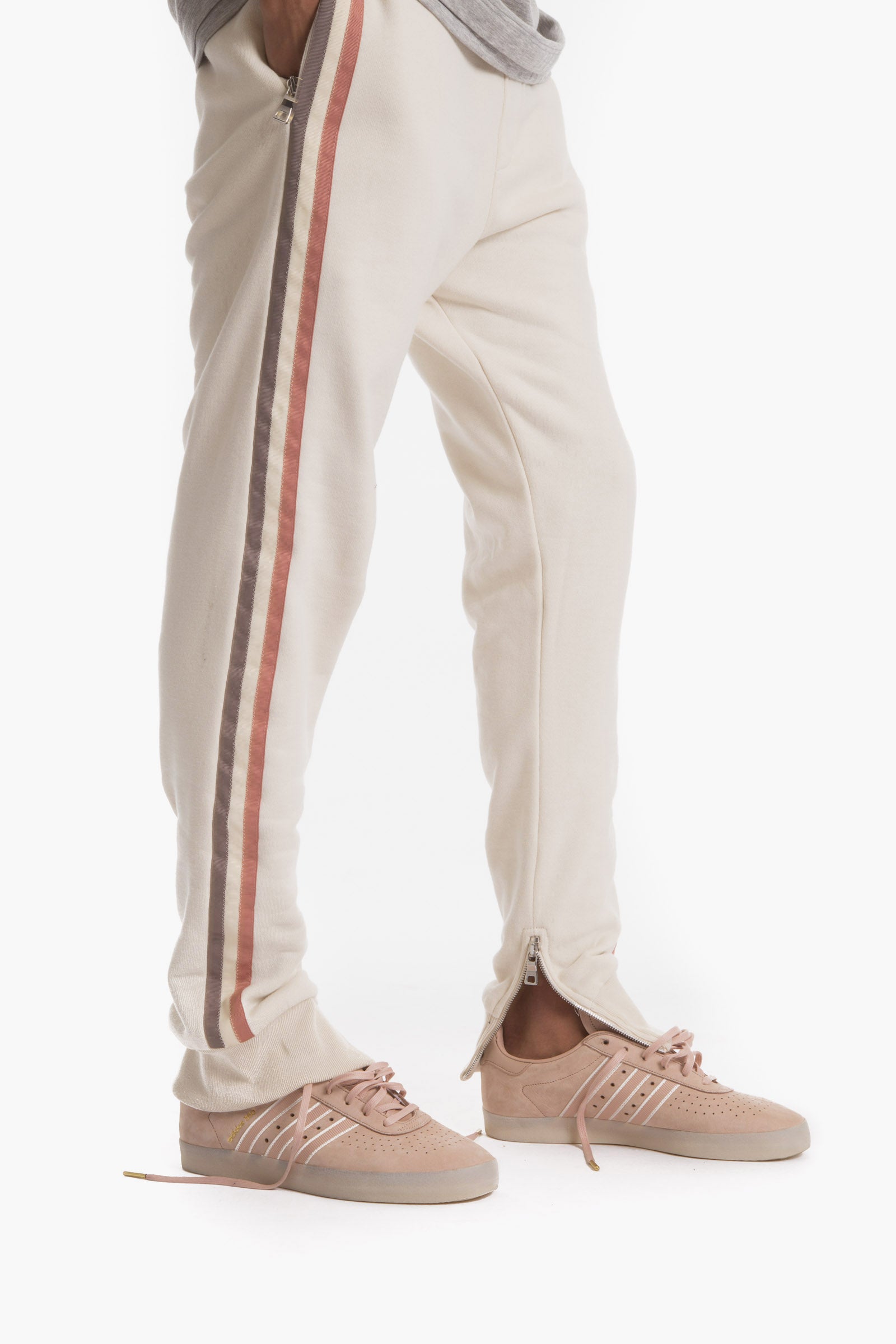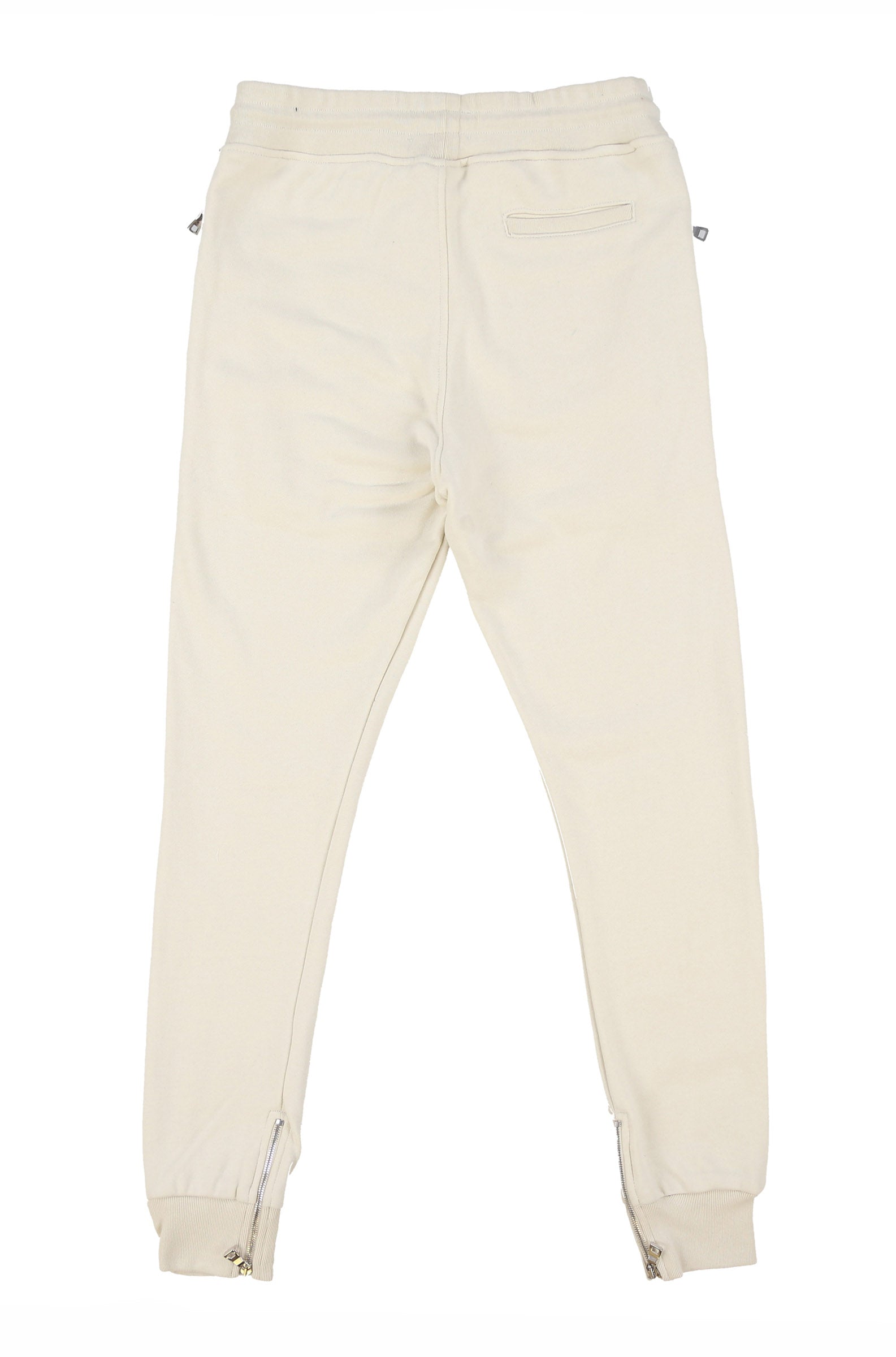 Japanese French Terry sweatpants with ribbed cuff at ankle. Ribbed waistband with drawstring closure, 2 Lampo zipper pockets at the front, and 1 Lampo zipper pocket at the back. Cuffs have zipper gusset and custom tape on the outseam of legs.